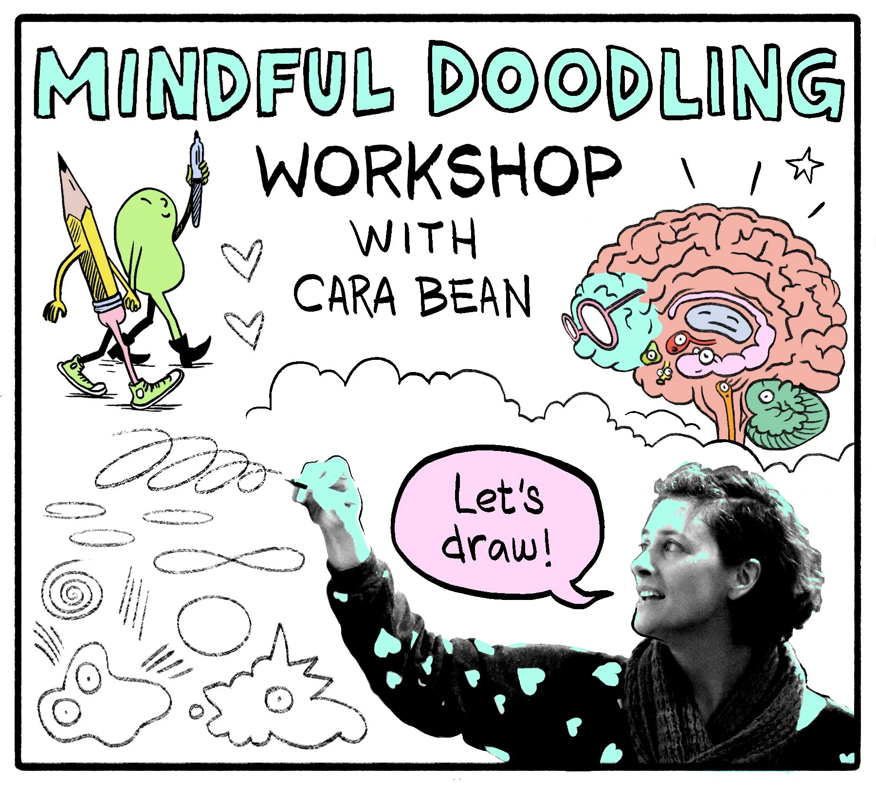 Mindful Doodling Workshop with Cara Bean. “Let’s draw!” Image of Cara drawing, cartoon brain, and pencil and bean.